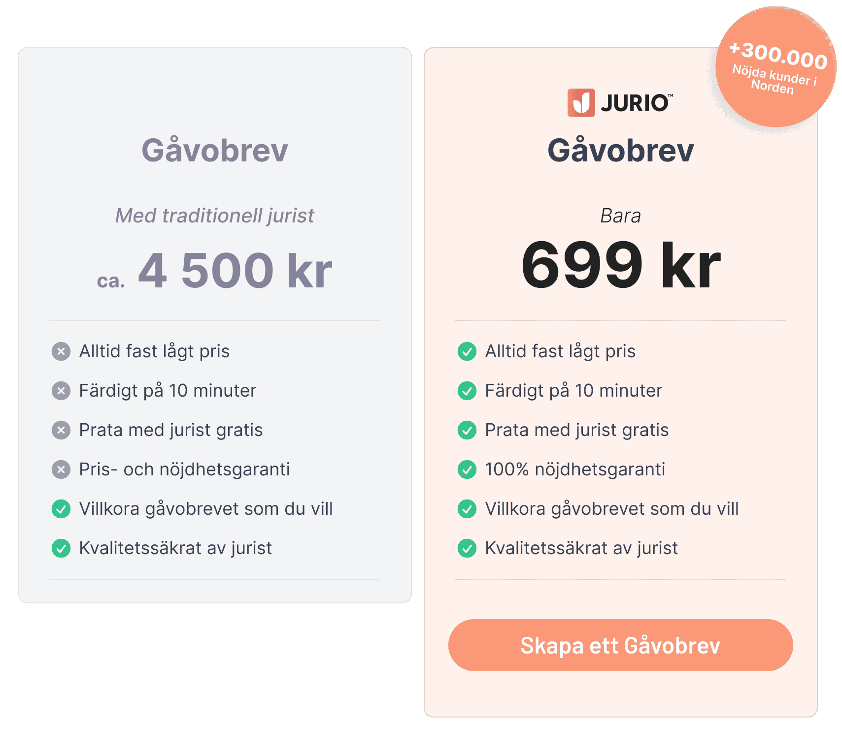När du ger bort något av större värde är det alltid en bra idé att upprätta ett gåvobrev. Där kan du reglera överlåtelsen av gåvan och skriva villkor som skapar trygghet för gåvotagaren. Med Jurio kan du skapa ett gåvobrev idag, signera med BankID och få dokumentet direkt.