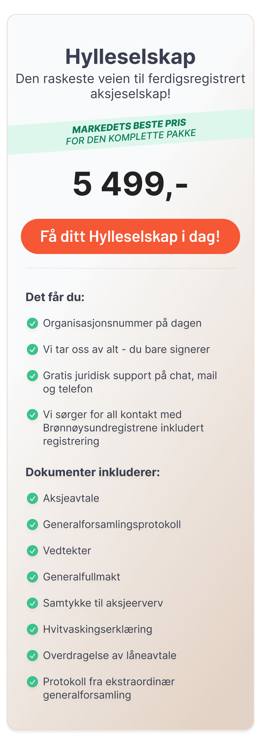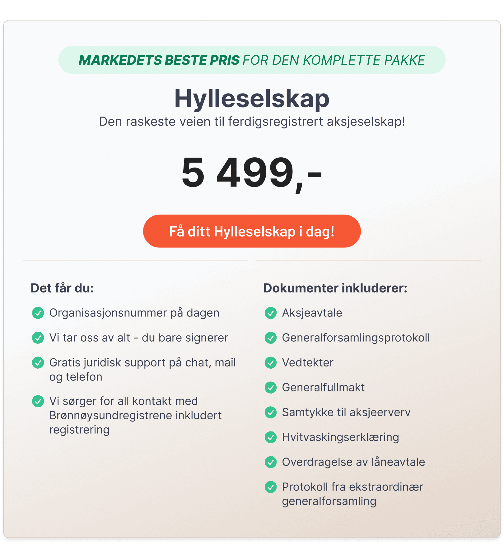 Ved å kjøpe et hylleselskap slipper du å vente på Brønnøysundregistrenes registreringsperiode og lange saksbehandlingstider, og sparer dermed masse tid. Det nye selskapet ditt får organisasjonsnummer på dagen.