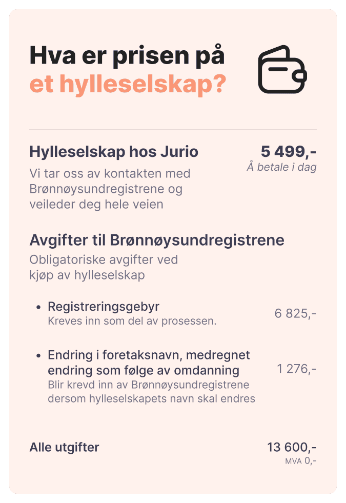 Prisen for selve hylleselskapet er NOK 5 499, i tillegg til et registreringsgebyr på NOK 6 825 til Brønnøysundregistrene (et obligatorisk gebyr for alle AS).