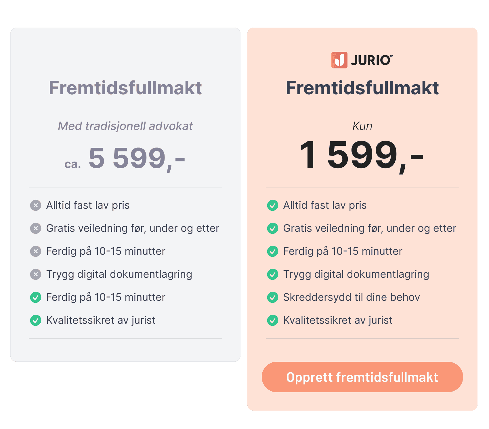 Med Jurio kan du raskt og enkelt opprette en fremtidsfullmakt i dag! Vårt online formular guider deg sikkert gjennom prosessen og sikrer at du får en fremtidsfullmakt som oppfyller dine ønsker og behov. Klikk på 'Opprett fremtidsfullmakt' for å komme i gang!