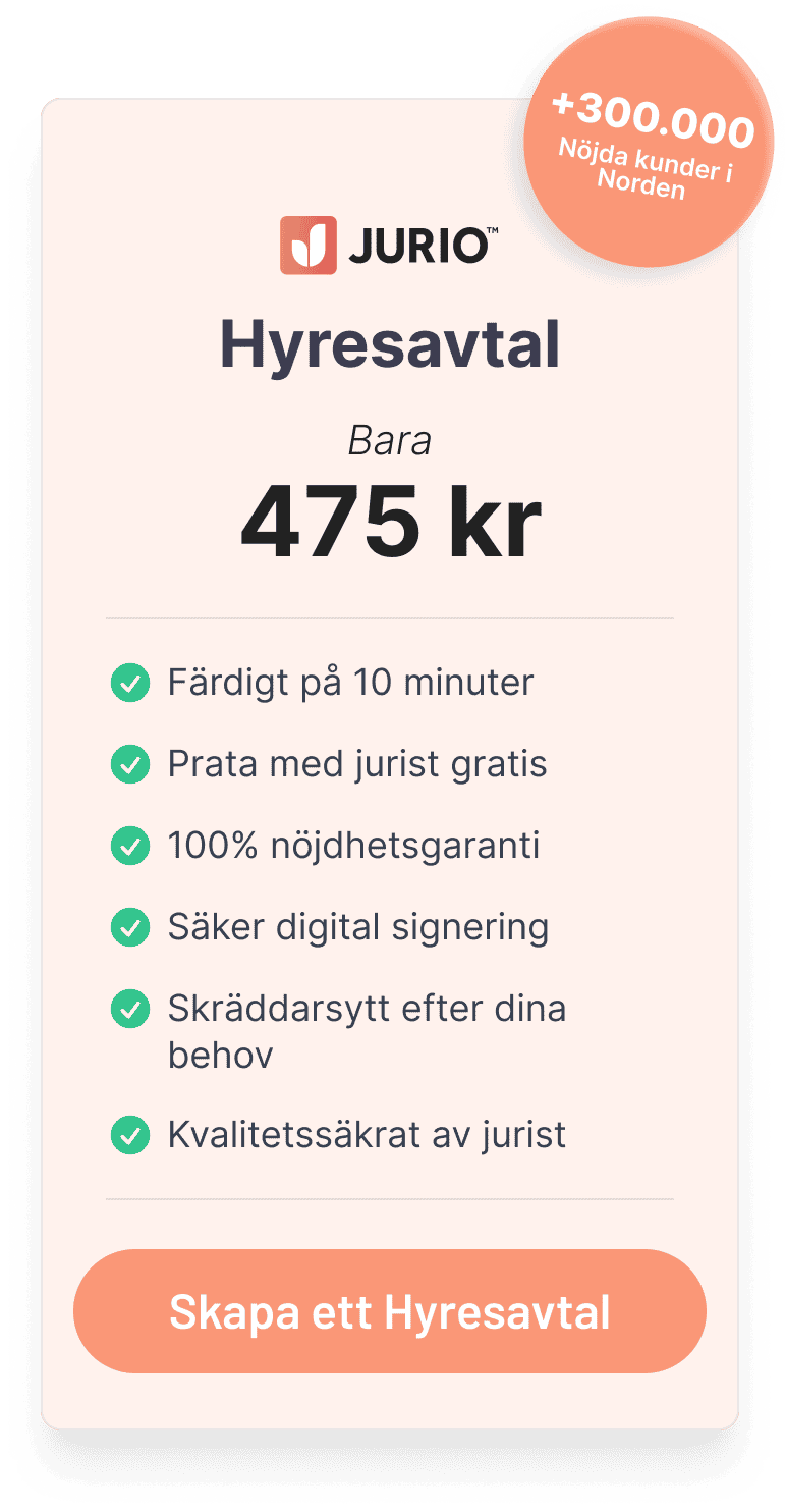 Skriv ett hyreskontrakt med JurioSka du hyra ut din bostad? Jurio hjälper dig att skapa ett skräddarsytt hyreskontraktavtal som uppfyller alla juridiska formkrav. Du skapar avtalet genom att svara på ett antal frågor i vårt formulär. Du kan hoppa fram och tillbaka mellan frågorna och när du är helt nöjd kan du skapa ditt hyresavtal som uppfyller alla dina behov.
