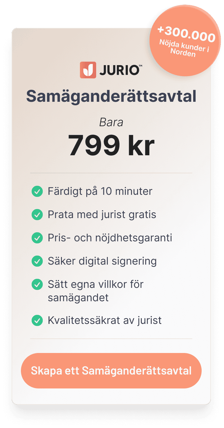 Med Jurios samäganderättsavtal kan ni skapa en trygg grund för ert samägande. Genom att svara på frågor i vårt smarta formulär skapas ett samäganderättsavtal på bara några minuter. Avtalet levereras till er direkt, elektroniskt och kan smidigt signeras med BankID eller skrivas ut och undertecknas för hand. Tryggt, smidigt och enkelt – och till en bråkdel av priset hos en traditionell advokat.