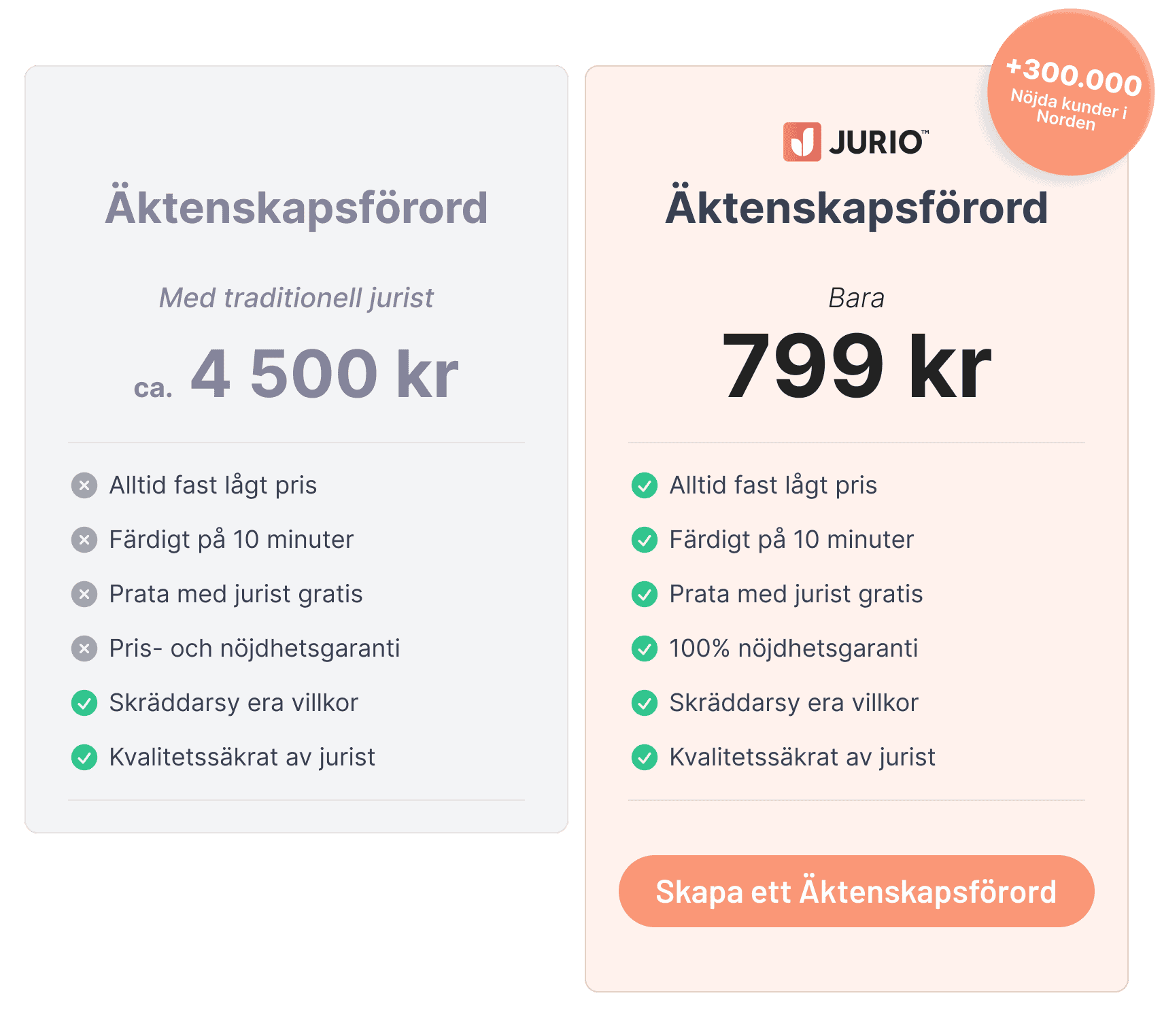 Att skriva ett äktenskapsförord har aldrig varit enklare. Med Jurio kan du komma igång direkt. Vårt formulär leder dig säkert genom processen, så att du får ett personligt anpassat äktenskapsförord som täcker just dina behov och önskemål.