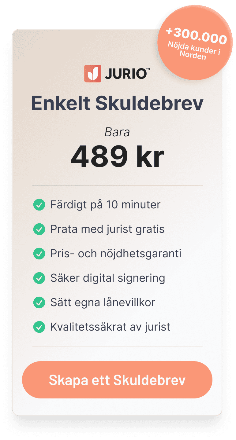 Genom att skriva ett enkelt skuldebrev kan du undvika missförstånd och konflikter när du lånar ut pengar till familj och vänner. Med Jurio kan du skapa ett enkelt skuldebrev som uppfyller alla rättsliga krav.