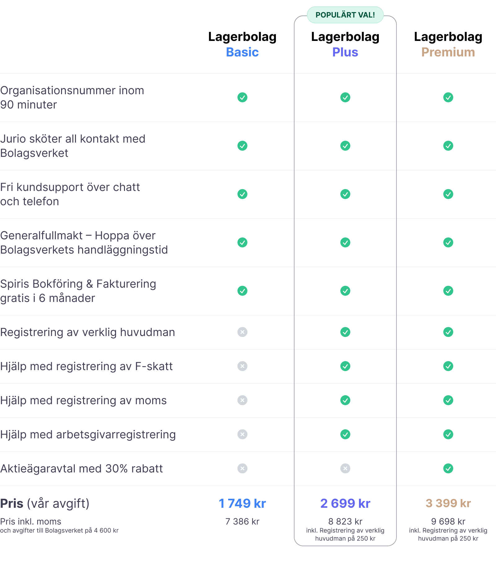 *Nöjdhetsgarantin gäller tills vi har utfärdat bankfullmakten. Priset är exkl. moms och Bolagsverkets avgifter på 4 600. Total kostnad blir 8 636,25 kr, inkl. moms. 25 000 kr i aktiekapital tillkommer.