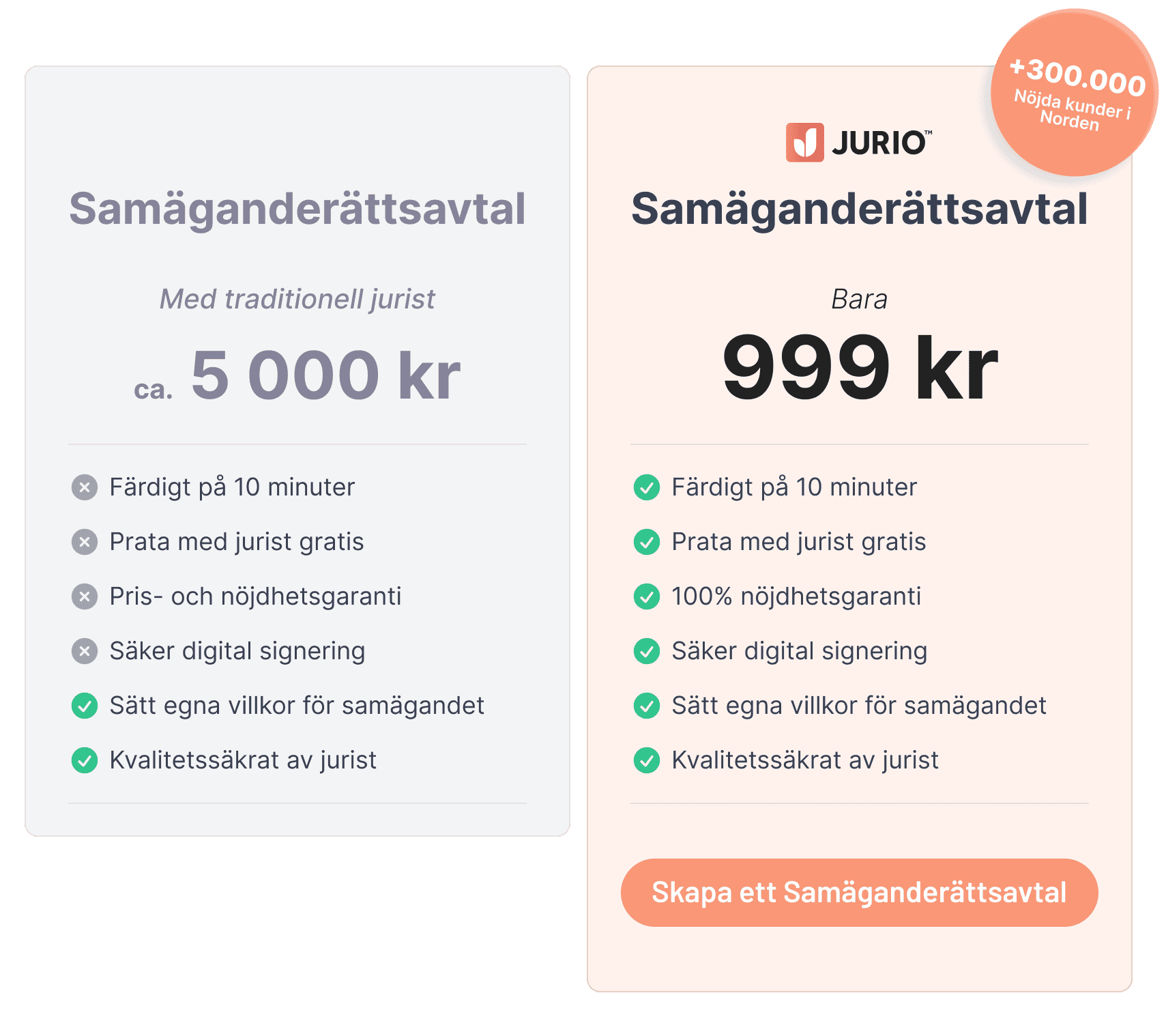 Skapa ett samäganderättsavtal med Jurio Att skriva ett samäganderättsavtal har aldrig varit enklare! Med Jurio får ni hjälp att skapa ett samäganderättsavtal som passar er. Ni svarar på frågor i vårt smarta formulär som leder er genom processen. Det går snabbt och smidigt och när ni är färdiga får ni ett samäganderättsavtal som är anpassat efter era behov och önskemål.
